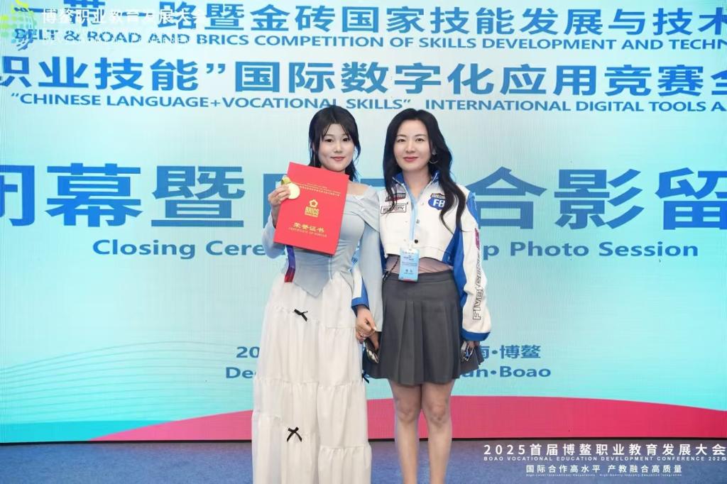12月7日至8日,2025“一带一路”暨金砖国家技能发展与技术创新大赛“中文+职业技能”赛项全国总决赛在海南博鳌圆满落幕。学前教育学院学生周子涵,在陆明伟老师的专业指导下,凭借过硬的综合实力,成功摘得一等奖桂冠,实现了学校在该项赛事中的历史性突破。